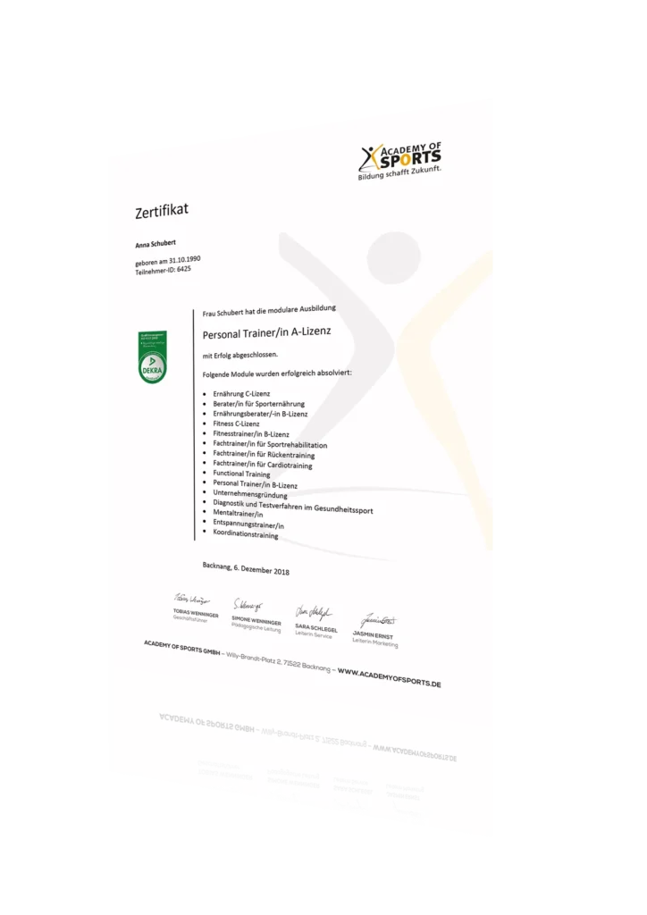 Mein fachliches Wissen und Know-how als Personal Trainer Braunschweig und Ernährungsberater Braunschweig konnte ich mir aus einem selbstfinanzierten Fernstudium bei der Academy of Sports mit der Personal Trainer A-Lizenz durch selbstorganisiertes Lernen aneignen und erfolgreich abschließen.